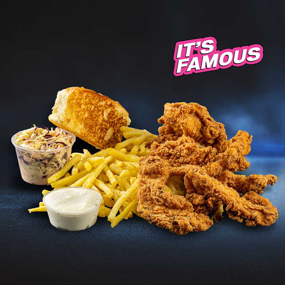 5 chicken fingers 200g , cartofi prajiti 150g, salata coleslaw 80g, sos mayo garlic 50g, felie de paine 20g / 500 g